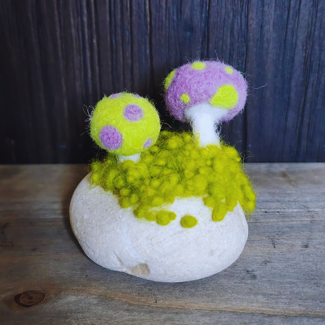 Ready to discover a touch of enchanting whimsy and vibrant color for your space? You'll love these captivating handmade, wool needle-felted Magic Mushrooms on a Real White Granite Stone! Each unique piece features two tiny, brightly colored mushrooms, nestled charmingly on a genuine white granite stone.