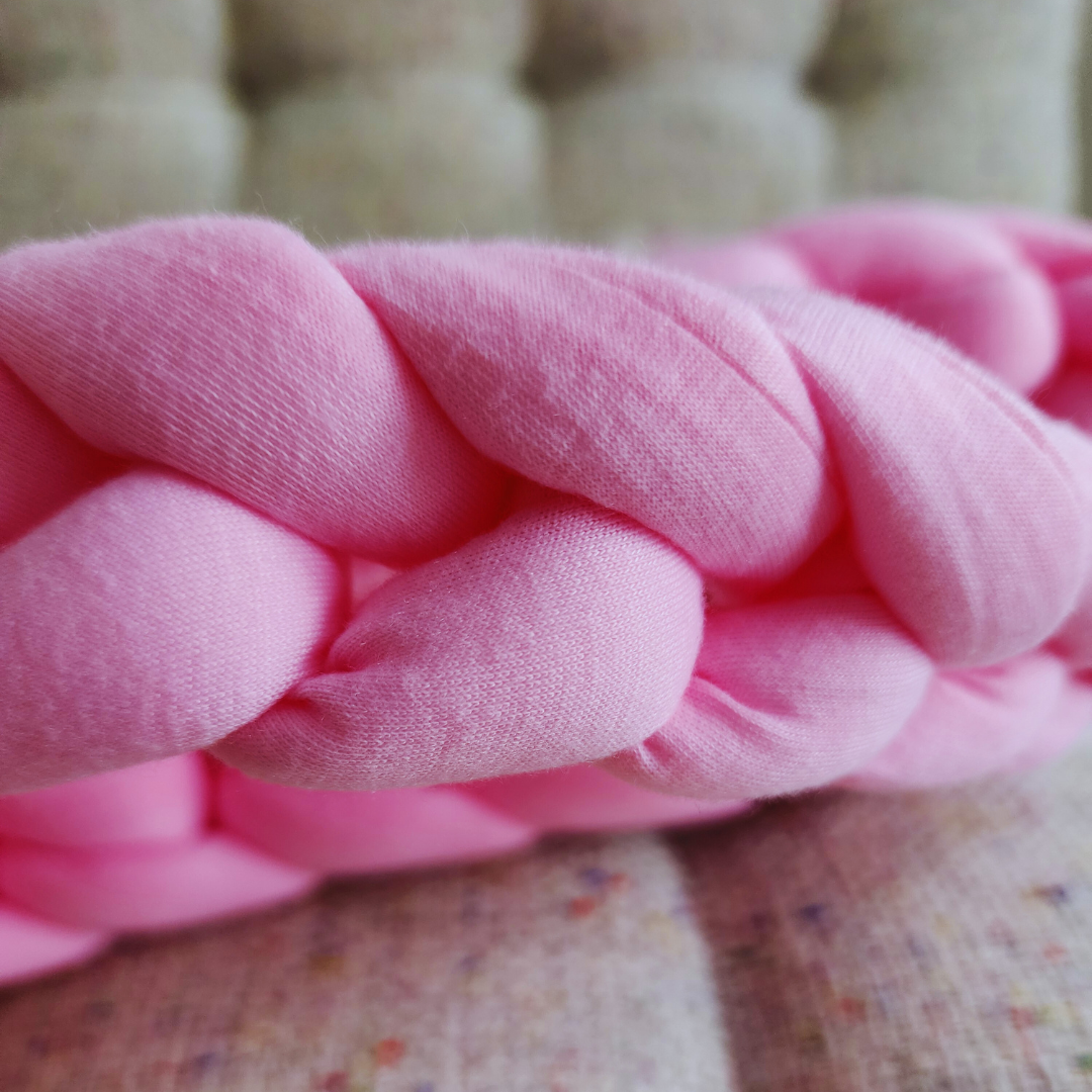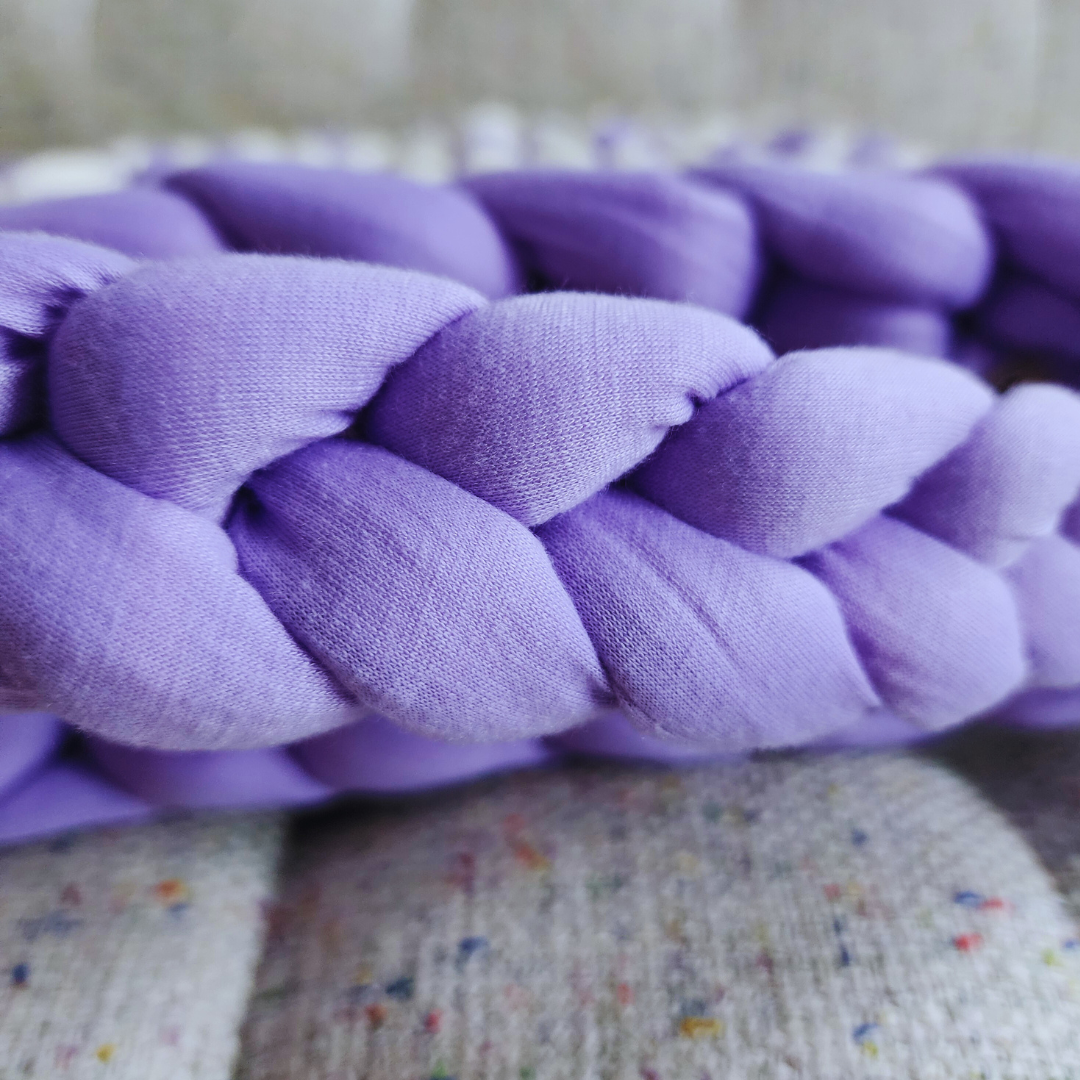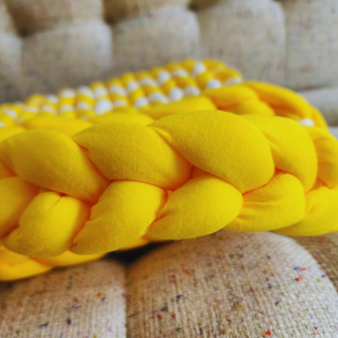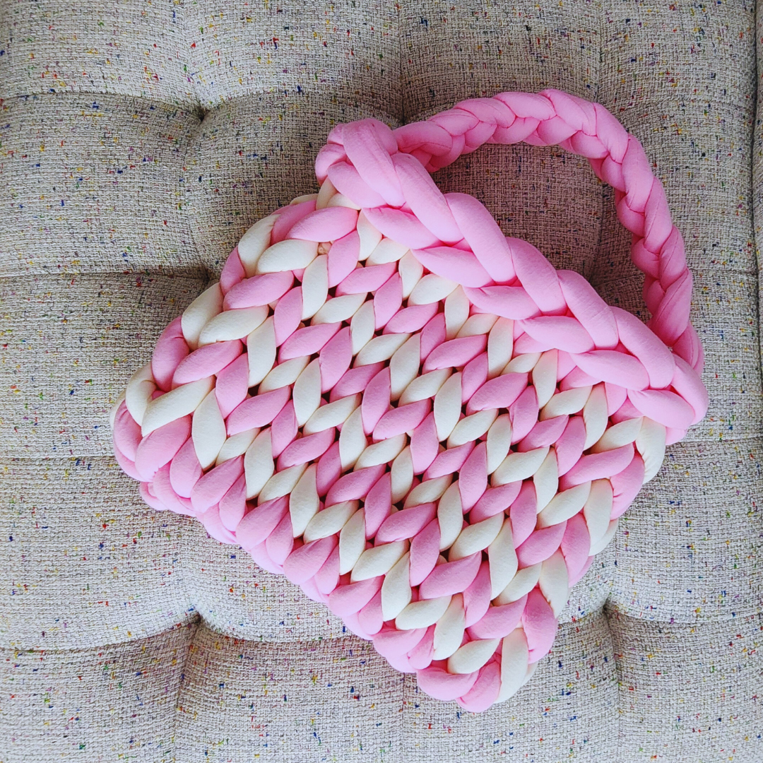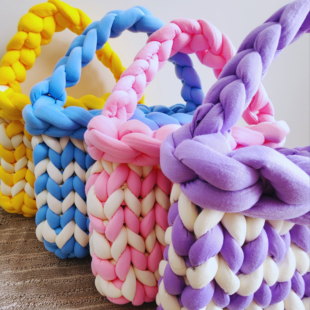 Each large tote is meticulously handcrafted by me, showcasing eye-catching stripes alternating white with an assorted color, creating a vibrant and cheerful look. The unique braided handle adds a touch of artisanal detail and feels comfortable on your shoulder. I knit these bags using bulky tubular yarn with a polyester core, which not only gives them a wonderfully soft and textured feel but also ensures they're durable enough for everyday adventures.